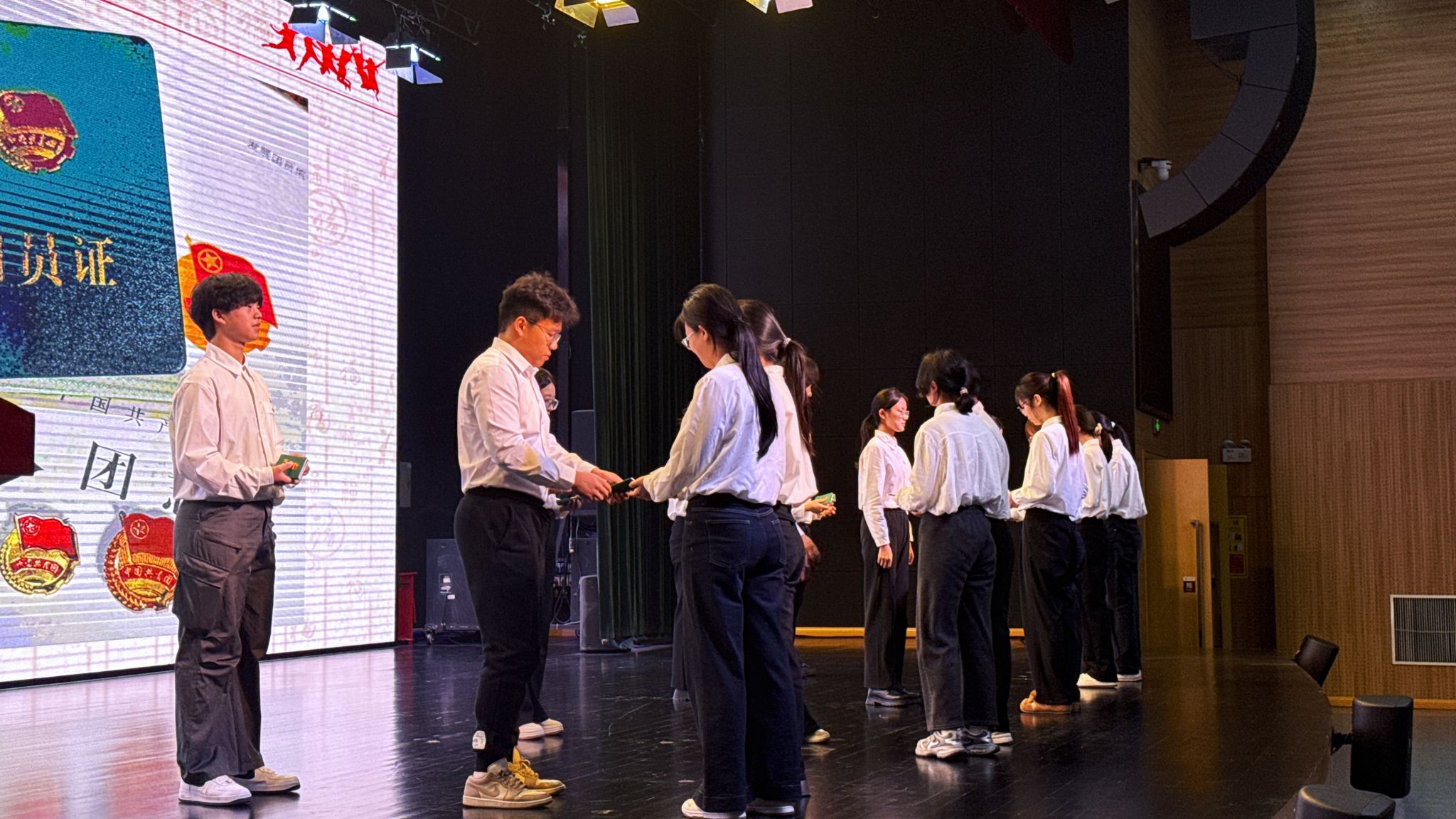 仪式伊始,全体与会人员肃立起身,高唱中华人民共和国国歌。嘹亮的歌声响彻会场,赤诚的热爱激荡心间,大家以炽热的目光凝望国旗,在庄严肃穆的氛围中,本次入团仪式拉开了序幕。随后,崔洋洋同学郑重宣读新团员名单,宣告一批优秀青年即将迈入共青团的大门。紧接着,老团员代表依次为新团员佩戴团徽、颁发团员证,一枚枚团徽闪耀胸前,一本本证书承载使命,标志着新团员正式成为共青团组织的一员。在梁思晨同学的领誓下,全体新团员高举右拳,面向团旗庄严宣誓。铮铮誓言回荡在会场,既凝结着共青团员的责任担当,更许下了不负韶华、报效祖国的青春承诺。